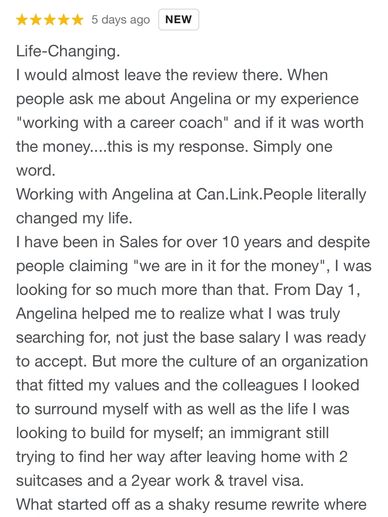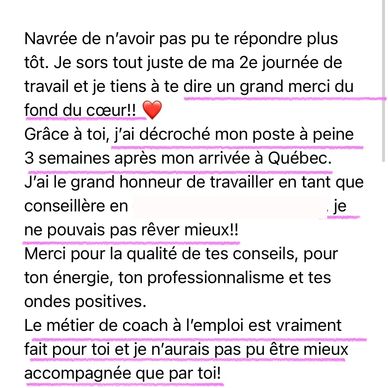 La maîtrise des compétences en recherche d'emploi a changé la vie de mes clients, et maintenant je me suis donné pour mission de soutenir autant de personnes que possible afin qu'elles puissent avoir la sécurité d'emploi lorsqu'elles déménagent au Canada, changent de carrière ou recherchent un emploi en toute tranquillité.