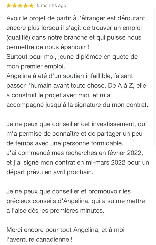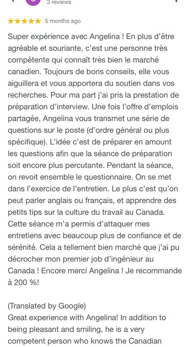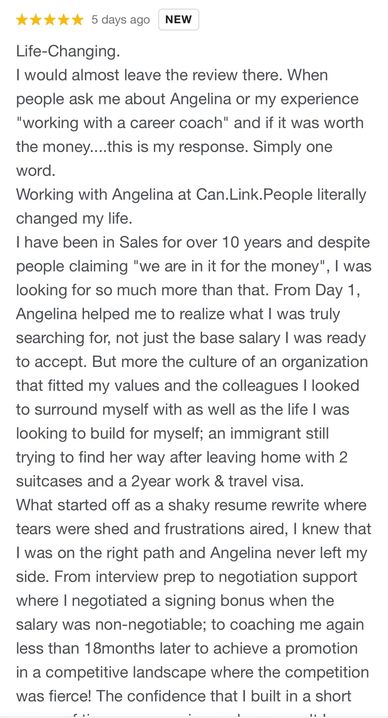 Angelina was instrumental in my journey of switching careers and finding my dream job. Embarking on the journey of looking for a new job during a pandemic can be pretty daunting, but Angelina is like the secret weapon behind your success; she's so thoughtful, patient and knowledgeable that she made what can be a stressful time as straightforward as possible.